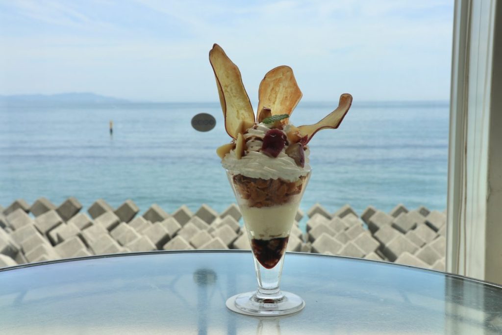 テラスカフェ「オーゲ」では、鳴門海峡のパノラマビューを眺めながら、ご当地スイーツやグルメを味わえます。「鳴門金時タルト」(680円)や「鳴門金時パフェ」(1,350円)など、地元の味覚を活かしたメニューが豊富。