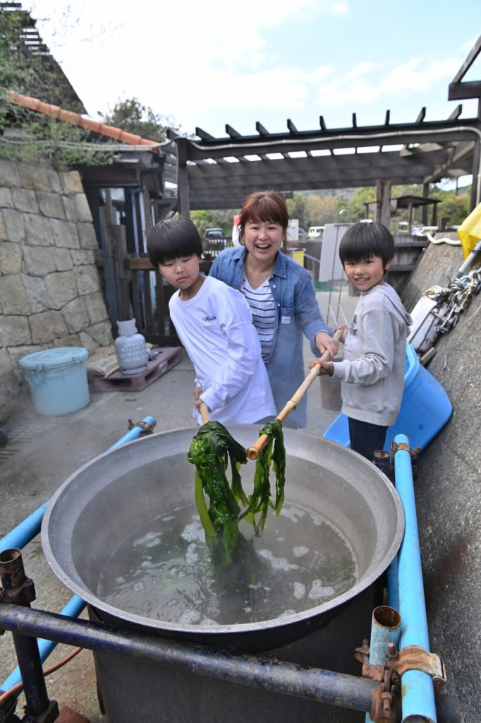 収穫した生わかめは茶褐色ですが、湯通しすると鮮やかな緑色に変化する様子は、わかめが苦手なお子さんでも興味を持って観察できますよ!