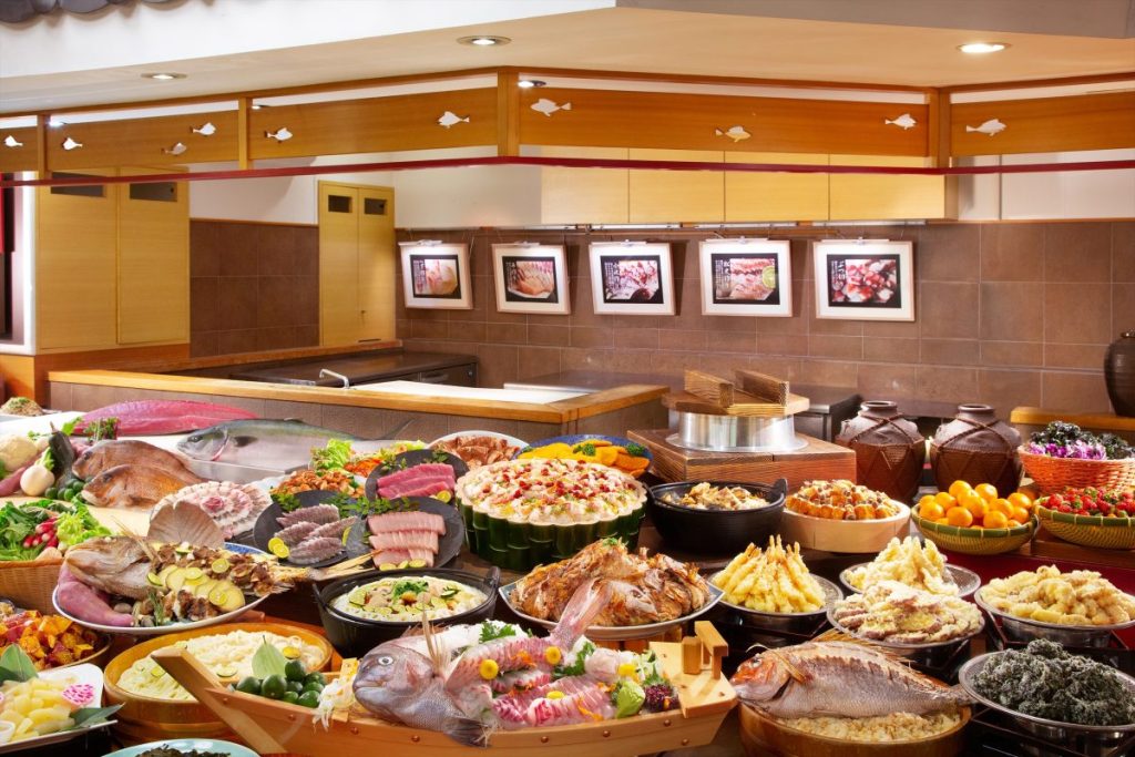 阿波の城下町をイメージした空間でいただく、ライブキッチンに、できたて料理の数々。鳴門鯛を使った様々な料理や、鳴門ワカメ、揚げたて天ぷら、鳴門金時スイーツなど、朝食は朝の定番メニュー、昼食は60種類、夕食は90種類ものメニューが並びます。