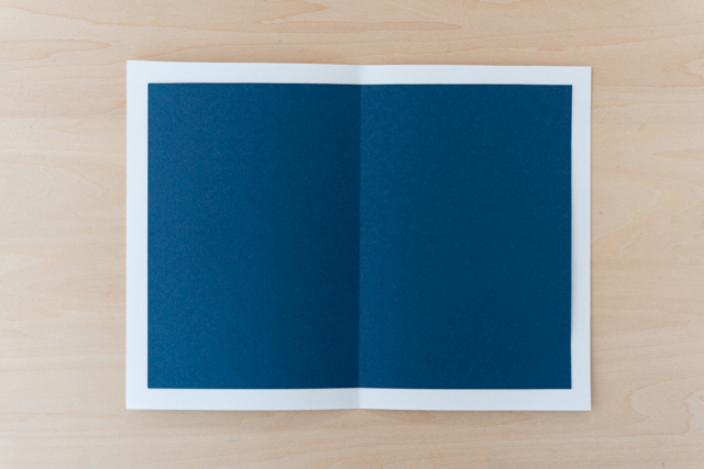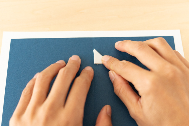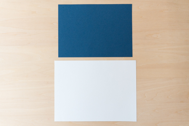 2. 一度それぞれの台紙を半分に折ってから、中心の線をあわせて、白い画用紙にネイビーの台紙を貼り合わせます。