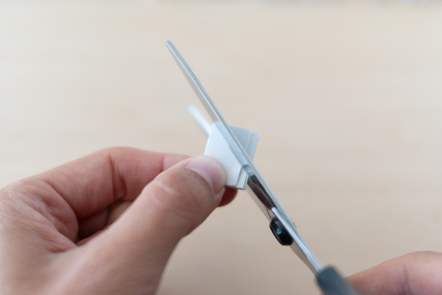 1. 2cmのじゃばらを、左に端が来るように縦長に持ち、左上の頂点から、右の辺の半ばまでをカットします。