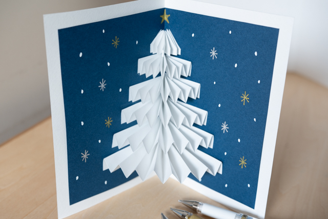コピー用紙を折って貼るだけで、ページを開いた瞬間ふわっとツリーが飛び出すポップアップカードが作れます。