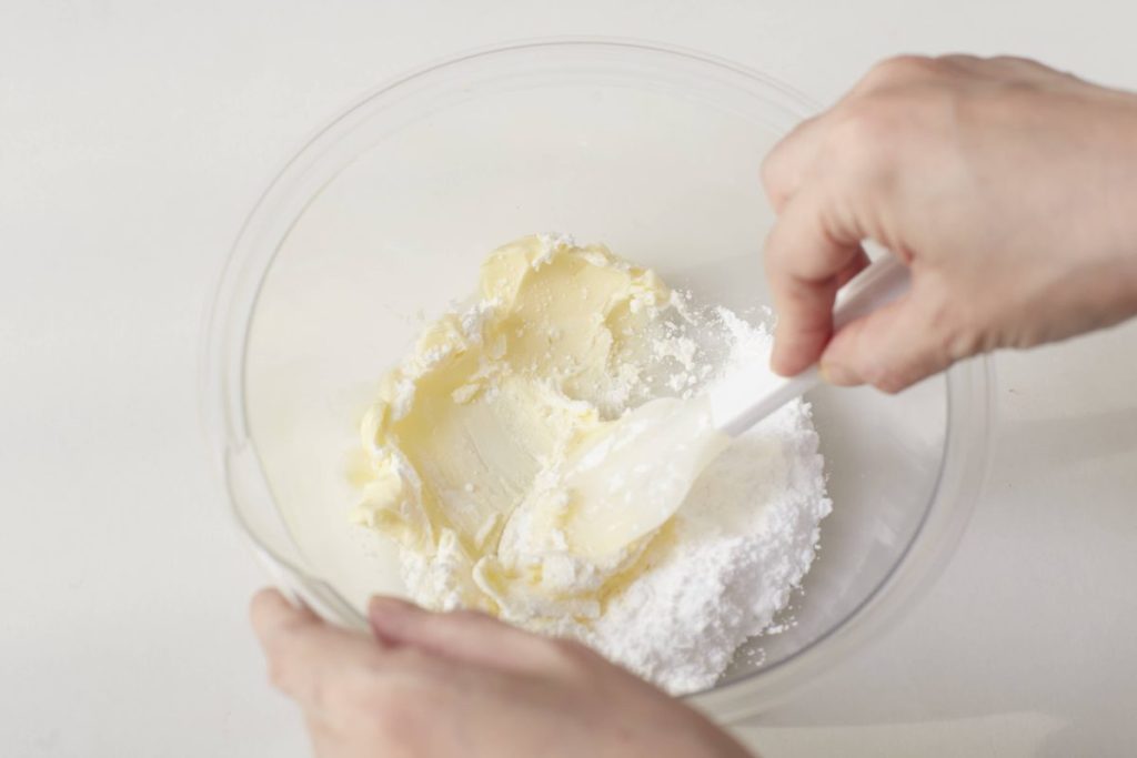 ① ボウルにバターを入れ、クリーム状に練る。粉糖、塩を加えすり混ぜる。