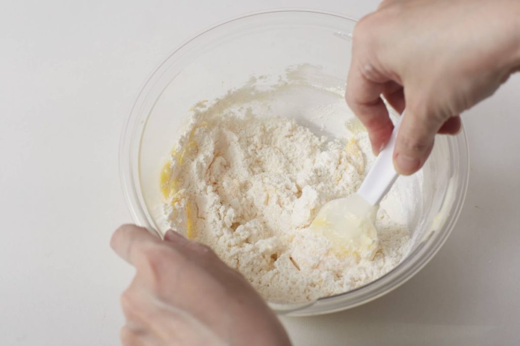 ③ ②に薄力粉を加え粉っぽさがなくなるまで混ぜたら生地をまとめる。