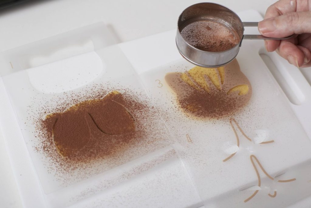 ⑧ ⑦にステンシル②またはステンシル③をのせ、茶こしでココアパウダーをふる。