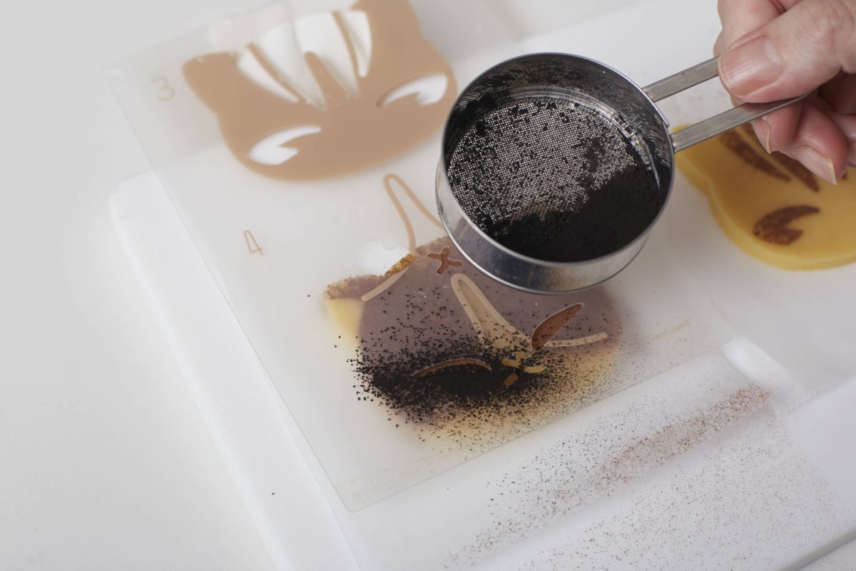 ⑨ ステンシル④をのせ、茶こしでブラックココアパウダーをふる。