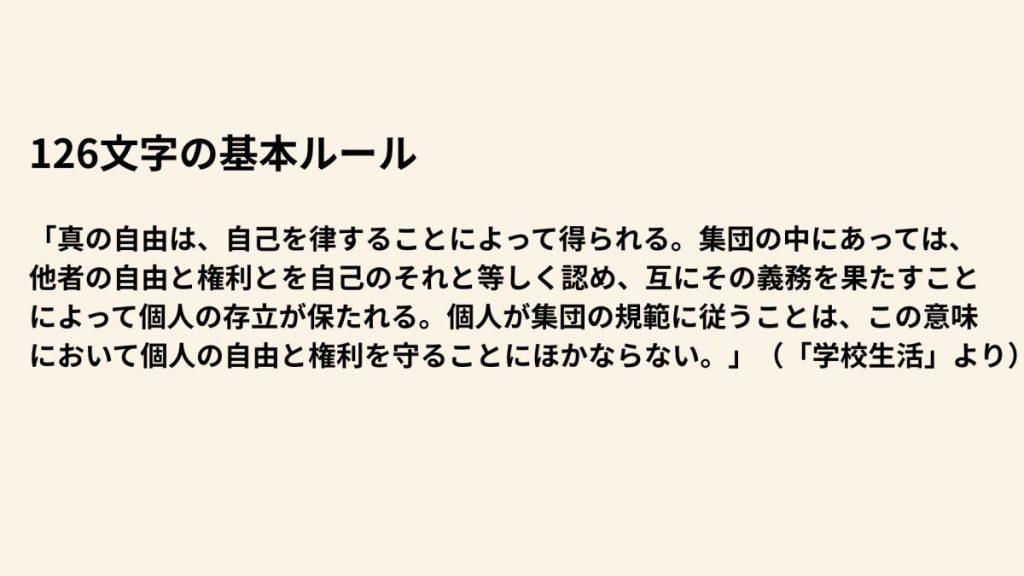 本校の高校には、細かく定めた校則がありません。あるのは126文字のルールだけで、要するに、「他者の自由を尊重してくれれば、あなたの自由も保障されます」ということが書かれています。
