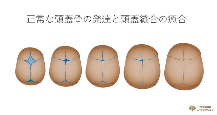 通常、赤ちゃんの頭の大きさは生後1年で2倍に成長します。それが可能になるのは、頭蓋に最初から隙間があるからです。小さい頃は大泉門や小泉門が開いている、とよく言いますね。あれも頭蓋の隙間です。頭の大きさがほぼ成長してきたら頭蓋の隙間が癒合していきます。でも最初から一部が閉じているとその部分では脳の拡大がおこらず、頭蓋骨の形がいびつになります。また脳が成長できず窮屈さを感じると、脳の発達に影響を与える可能性があります。