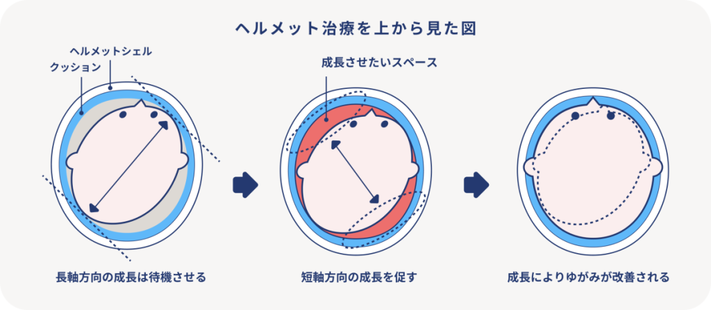 林先生 そこで、近年はヘルメット治療という選択肢があります。治療のメカニズムは下の図を見てわかるように、頭が大きくなることを利用してかたちを整える、というようなイメージです。ですから、赤ちゃんに適したヘルメットを作り、それをかぶることが治療になるわけです。
