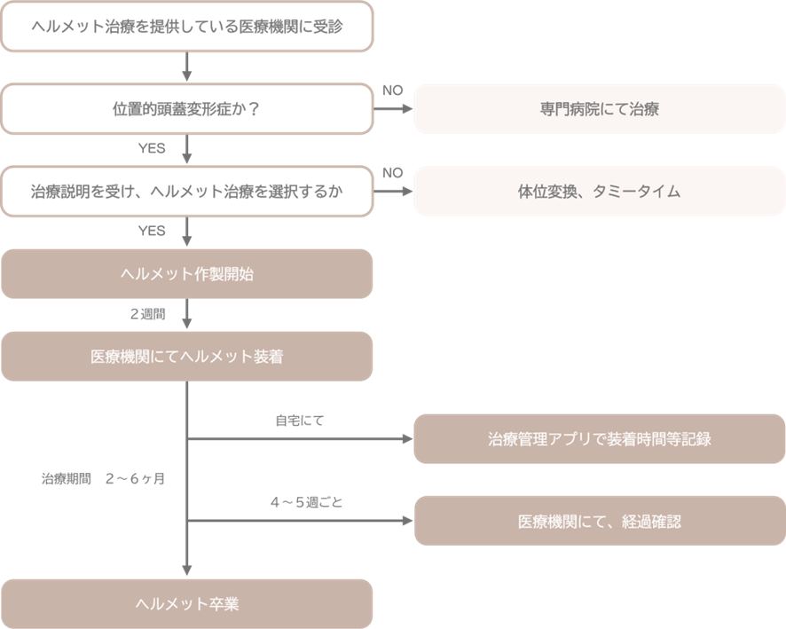 林先生 治療の流れは以下のようになります。まずは頭蓋縫合早期癒合症でないことを確認した上で行います。スタートは3-4ヶ月がおすすめです。タイミングを逃しても8ヶ月くらいまでにやるのが理想的といえます。