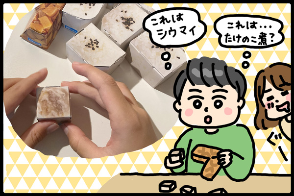 次男は「これなんだ? たけのこ煮…?」と、組み立てながら具材チェック。
