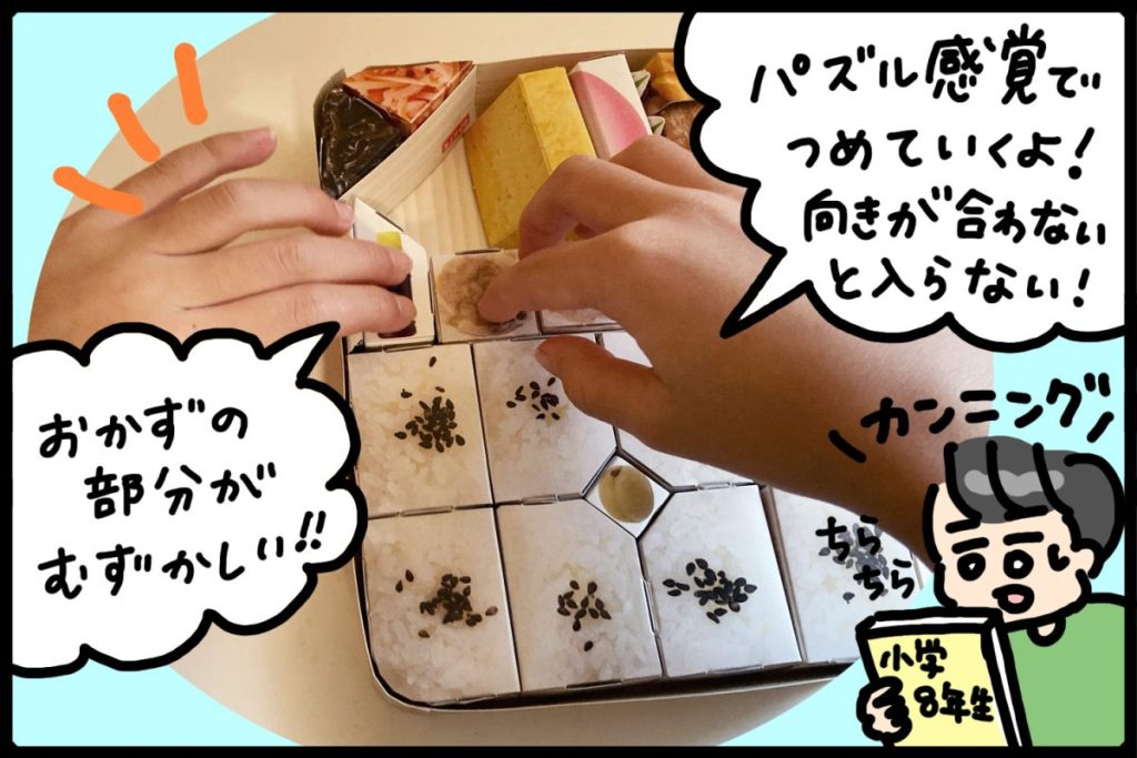 最初は見ないで詰めていましたが特におかず部分で苦戦してしまい、チラチラと見本を見ながらなんとかはめていきます。