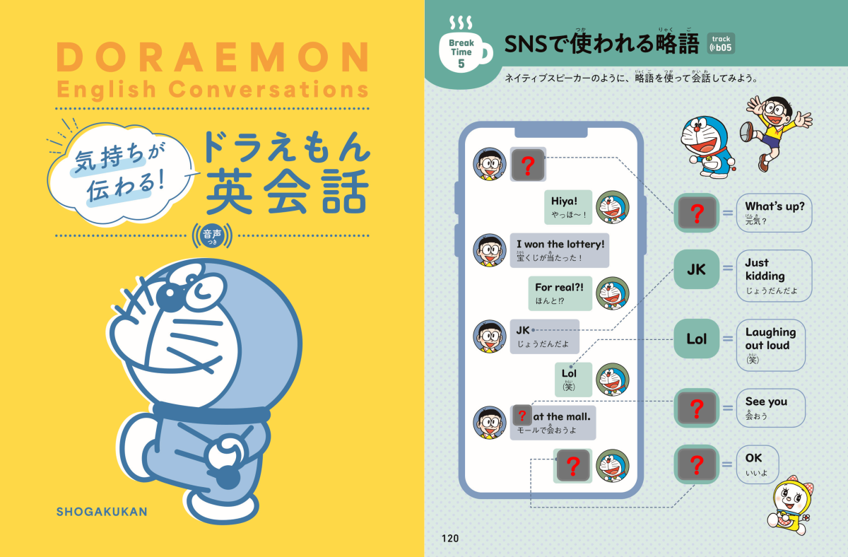 今回紹介した『気持ちが伝わる!ドラえもん英会話 音声つき』は“気持ちが伝わる”英語フレーズ166を、ドラえもんと仲間たちの楽しいイラストで学べる1冊です。感情別に整理された短いフレーズで、言いたい気持ちを自然に表現できるようになります。