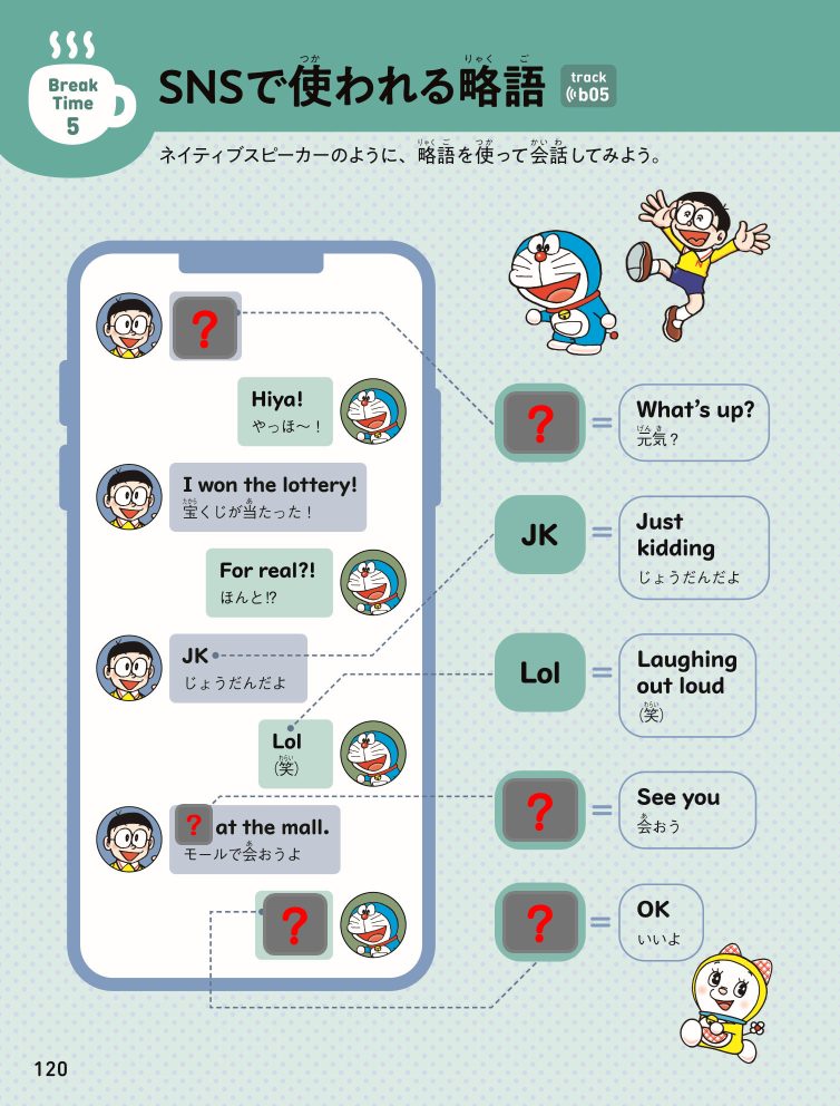 ドラえもんと仲間たちの楽しい【ひとこまイラスト+英語フレーズ】を眺めながら、感覚的に英語の使い方が身に付く1冊。今の気分にぴったりのフレーズ、言えそうで言えないひと言を感情別に分けて1ページ1フレーズで紹介。フレーズは短くて簡単なものばかりなので、使ってみたいお気に入りのものがきっと見つかります。楽しいイラストでその場の状況がひと目で理解できるので、初めて英語にふれる人、英語は苦手という人にもおすすめ。楽しい英語クイズのほか、すぐに役立つコラムも充実!英語の音声は特設サイトからストリーミングで聞ける仕組みに。全ページ漢字は総ルビ付きなので小学生からOKです。