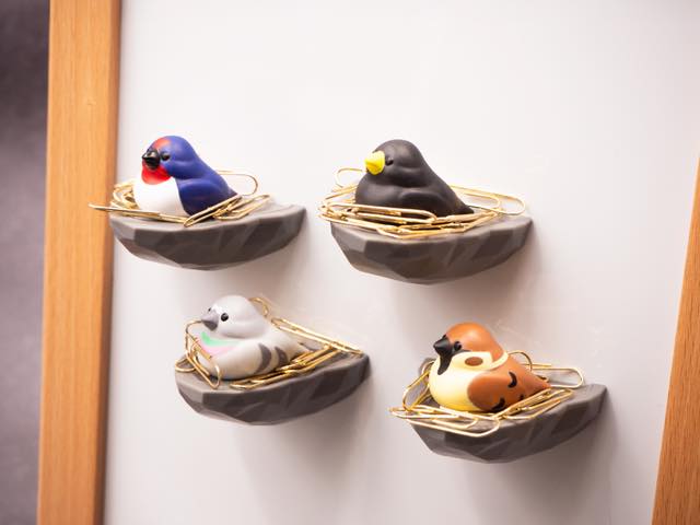 野鳥の巣作りをモチーフにした、マグネット式のクリップホルダーです。土台になっているグレーの部分に磁石が入っていて、磁石がくっつく机や金属製のブックエンドなどにくっつけます。金属製のクリップもトリの周りにくっつきますので、まるで野鳥がクリップで巣を作っているように、かわいらしくクリップを保持してくれます。