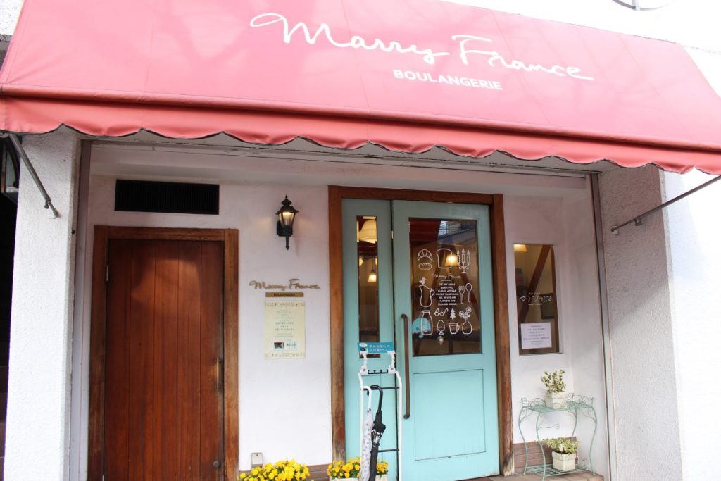 地下鉄「北山駅」から北山通り沿いを歩いて3~4分のところにある『マリーフランス 北山店』は、赤いテントとアンティーク調の水色の扉がかわいらしいお店です。