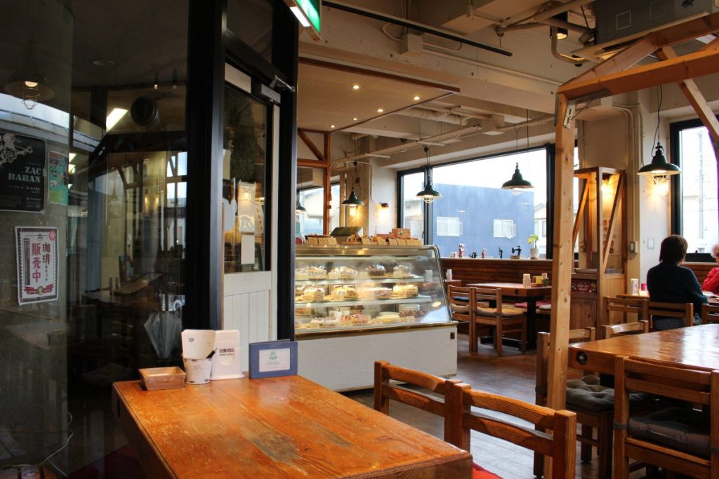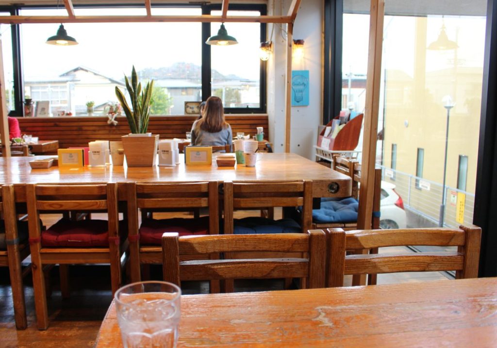 明るく広い店内は、木のテーブルと椅子が並べられていて、まるでログハウスの中にいるような落ち着く空間。大きな窓からは、遠くに緑を眺めることができます。