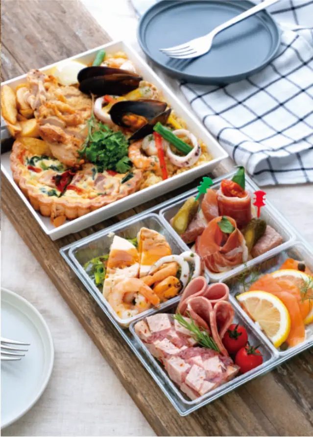 上段には、うにのムースやパテ・ド・カンパーニュ、生ハムカプレーゼ、スモークサーモンなど、冷菜を中心とした8種を盛り込み、前菜として楽しめる内容になっています。下段には、キッシュロレーヌやグリルチキン(バルサミコソース)、フライドポテト、パエリアなど、食べ応えのある温かみのあるメニューを詰め合わせました。