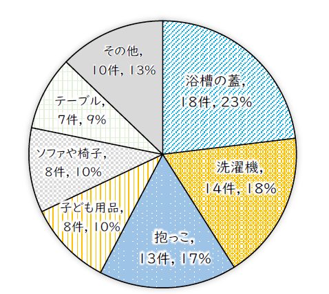最も多かったのは、浴槽のフタからの落下で23%(18件)、次いで洗濯機からの落下が18%(14件)でした(下図 落下事故の内容 n=78)。