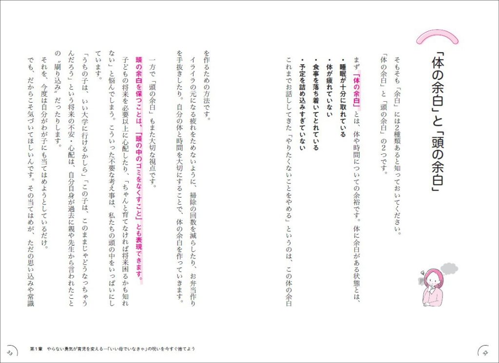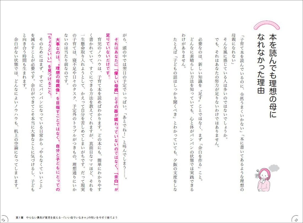あとは自分の親に言われてきたことを気づかず繰り返していることもあります。「勉強しなさい」とか「女の子らしくしなさい」とか。自分も言われて嫌だったかもしれないのに、なぜか同じことを言ってしまう。「勉強してほしい」って思うのも、結局は自分の不安を子どもに押し付けてるだけなんですよ。余白がないと、それに気づく暇もないですよね。