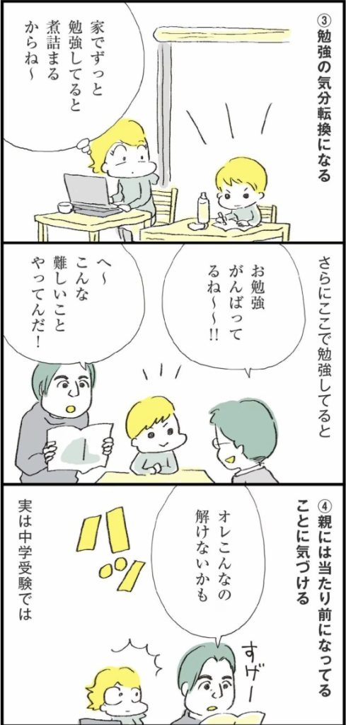 私の場合、親子で通っている高円寺のシェアスペースで息子が勉強をしていたら、そこにいた方が息子のテキストを見て「こんな難しいことをやってるの? 偉いね」って褒められたりびっくりされたりして。そこで「そうだった! この子は頑張ってるんだ!」って改めて思ったことがありました。