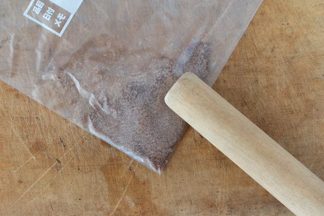 1. チョコクッキーをビニール袋に入れ、口をしっかり閉じ、麺棒などでたたいて粉々に砕きます。