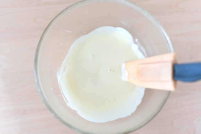 3. チョコレートを耐熱容器に入れ、電子レンジで加熱します(600ワットで1分半)。ゴムべらで混ぜ、溶け残りがないようにします。