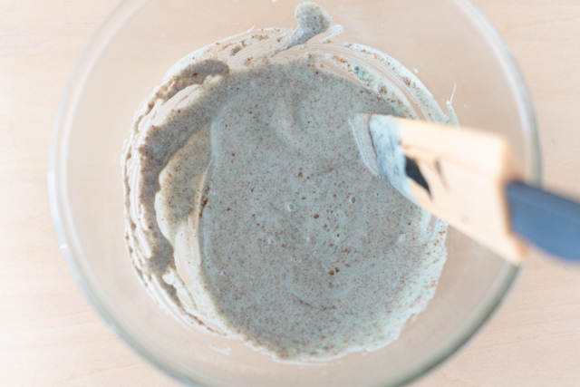 5. ゴムべらで全体の色が均一になるまで混ぜます。色が薄ければ、食紅や練りごまを少しずつ足して調整してください。