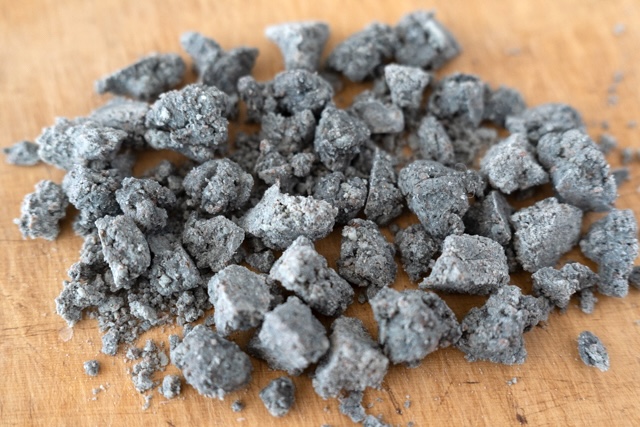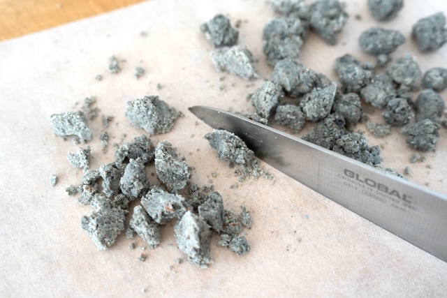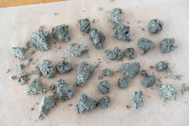 7. ビニール手袋をして、手でチョコレートを丸めたり、塊を割ったりして、1-2cmくらいの小石の形にしましょう。