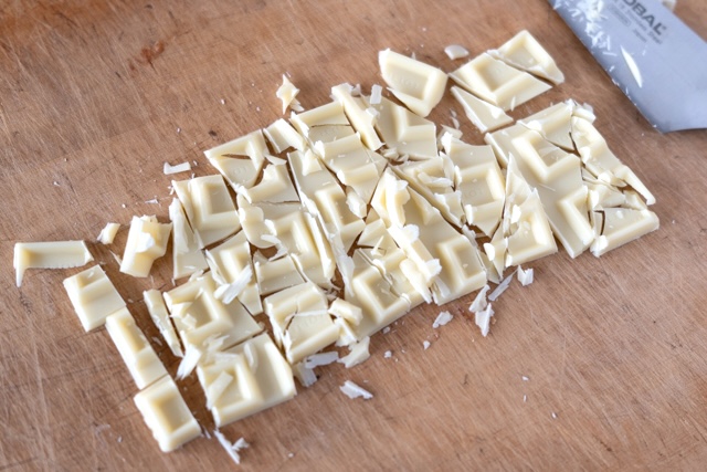 2. ホワイトチョコを包丁で粗く刻みます。
