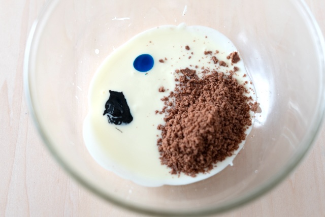 食紅の青と練りごまの黒で小石らしい色を、練りごまとチョコクッキーの粒感で、小石の黒いつぶつぶ模様を表現します。