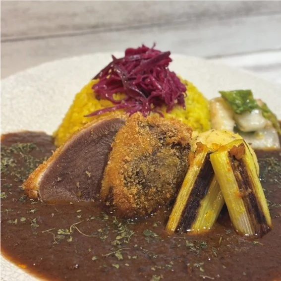 会場では、宮城県産の三元豚肩ロースを使ったブラックカレーを提供します。塊肉の柔らかさとローストスパイスの香りが特徴で、しっかりとした辛味と深い味わいが楽しめる一皿です。