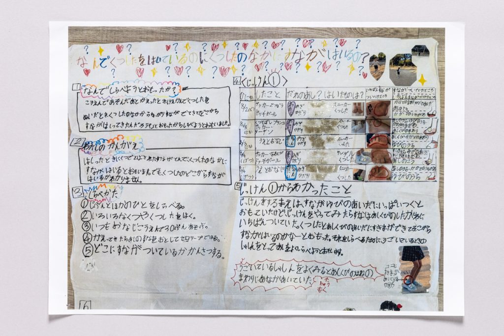 公園から帰ってきたとき、玄関で靴下を脱ぐと中から少し砂が出てきて、その砂がどこから入ってきたのかを不思議に思った美佑さんの自由研究。足についた砂をどうやって比べるか悩んだそう。重さをはかるより、実際に足についた砂をとってテープで貼りつけた方が見てわかりやすいか、など工夫されています。
