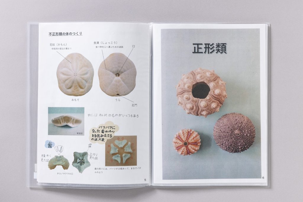 ウニ殻を集めるのが好きなので、ウニのすばらしさを知ってもらうためにウニ殻図鑑を作ろうと思った、という賢聖さん。 1cmのマスがあるカッター板を使って、ウニ殻の大きさがわかるように撮影しました。ウニ殻の紹介ページのすぐ後に、そのウニに関連した情報をのせることで、楽しく学べるように工夫しています。