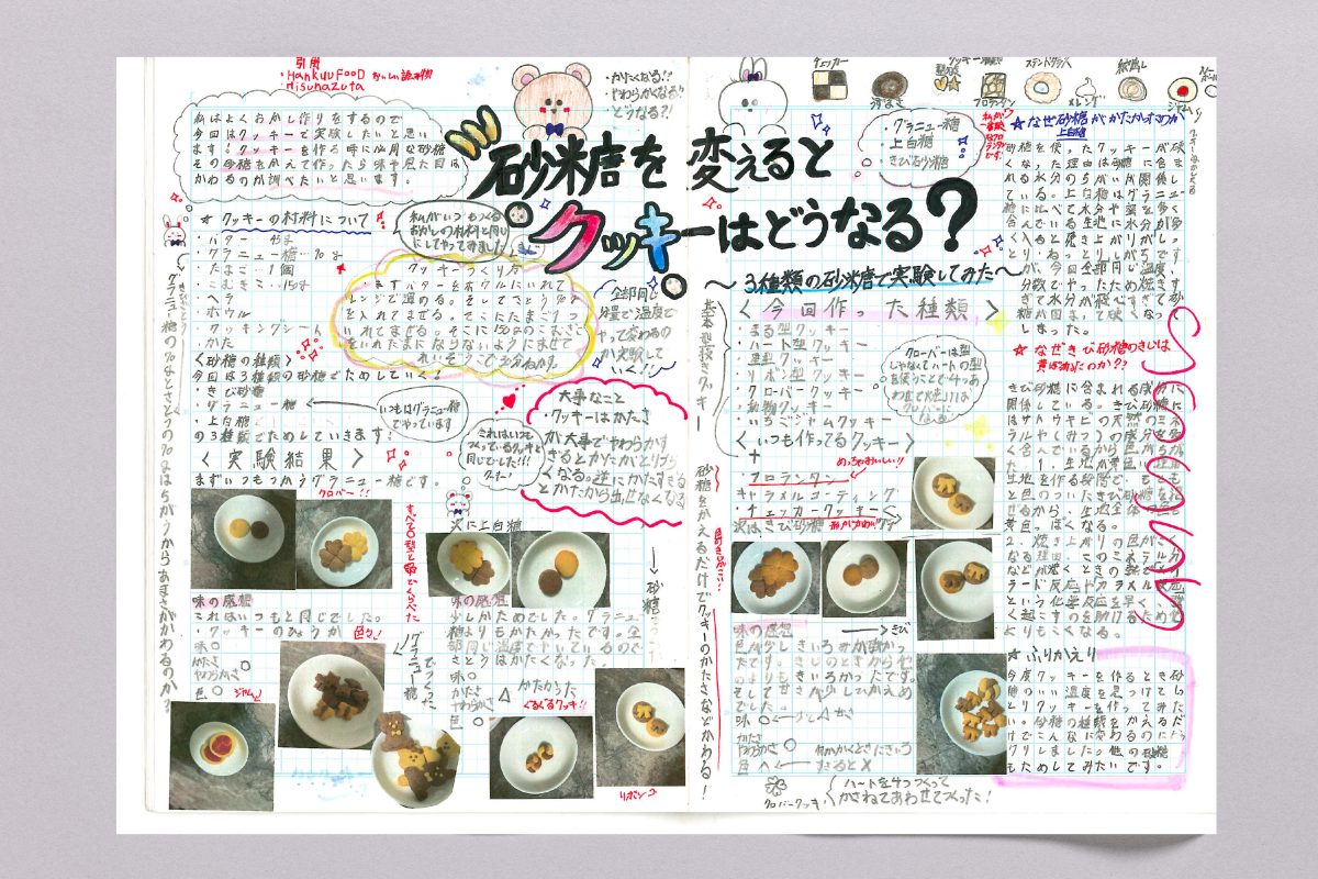 よくお菓子作りをするという桜子さんは、砂糖の種類を変えたらどうなるんだろうと思ったそう。どの砂糖がおいしくなるのか、きび砂糖・グラニュー糖・上白糖の3種類で実験。写真を使ってわかりやすく、クッキーの味や固さなどの結果について詳しく書くよう心がけました。