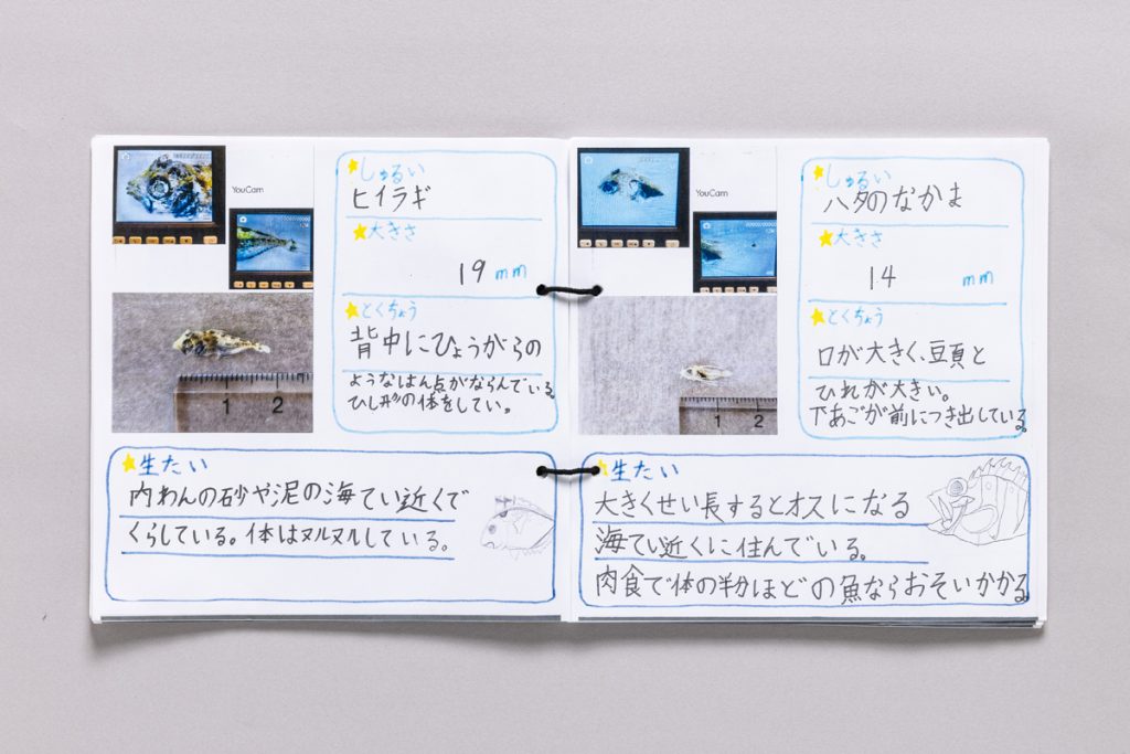 近所で開催されたチリメンモンスターを探すワークショップに参加して、見つけた生き物についてもっと知りたいと思い図鑑を作ることにした陸さん。1つのページに、その生き物について何を書けばわかりやすいか、見やすいか、見る人が興味を持てるか…などを考えて作りました。