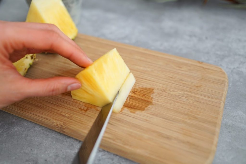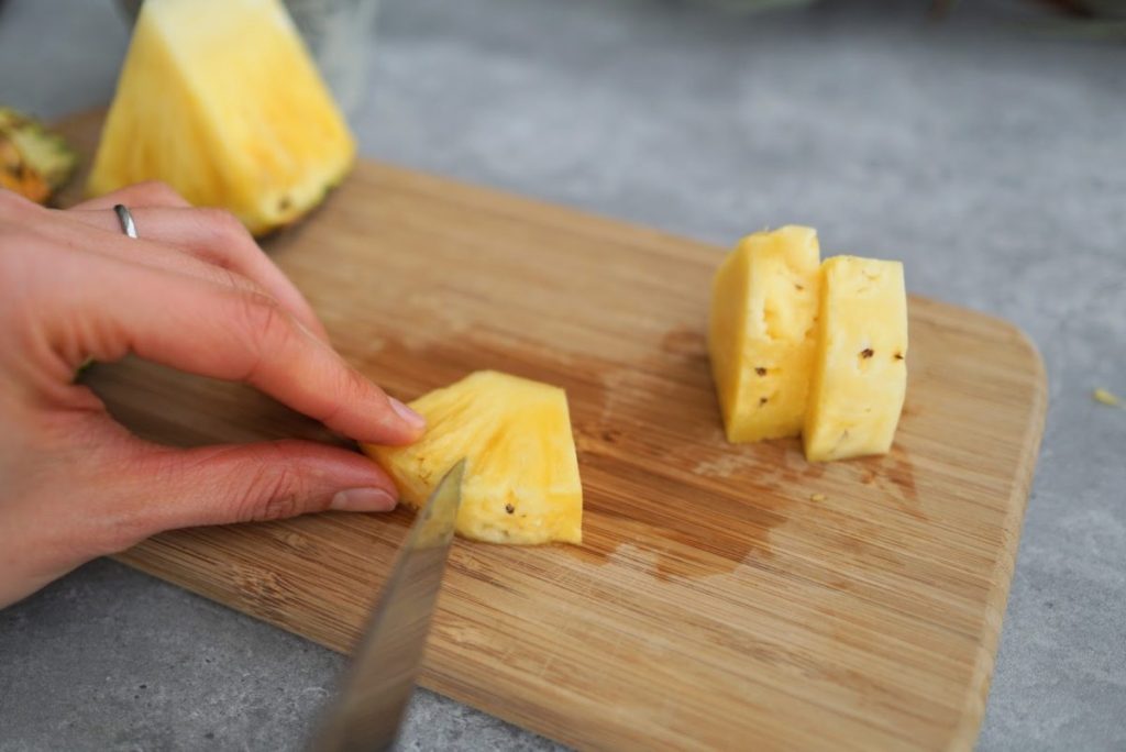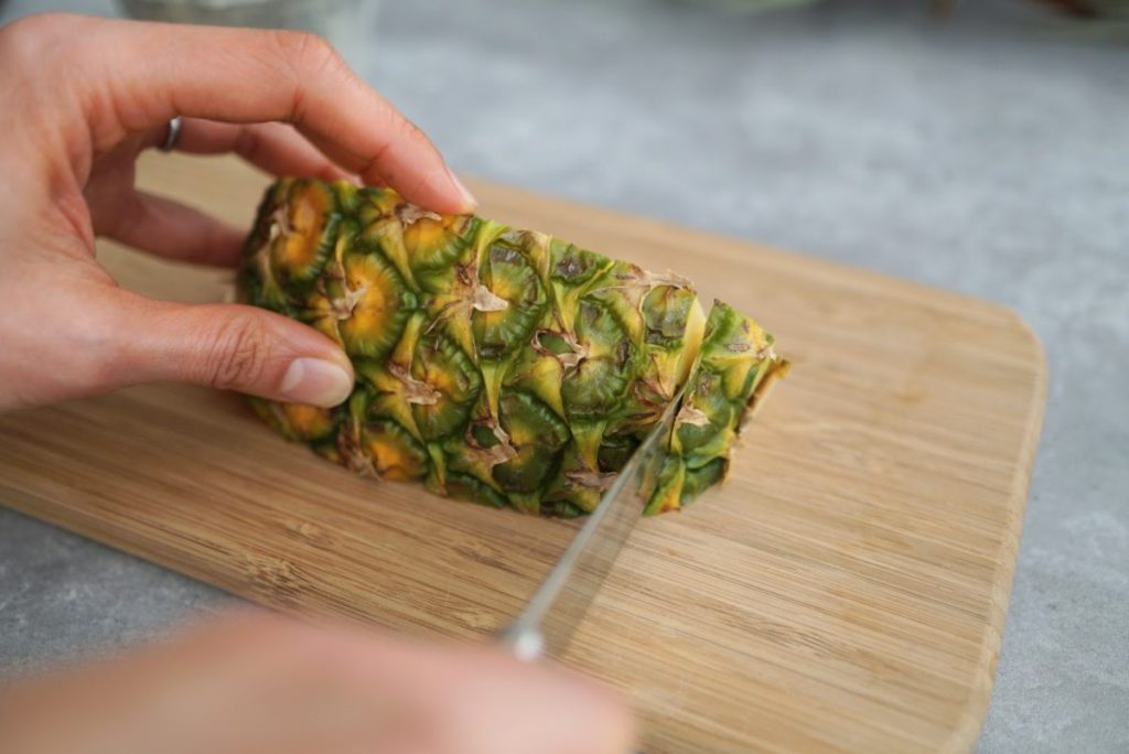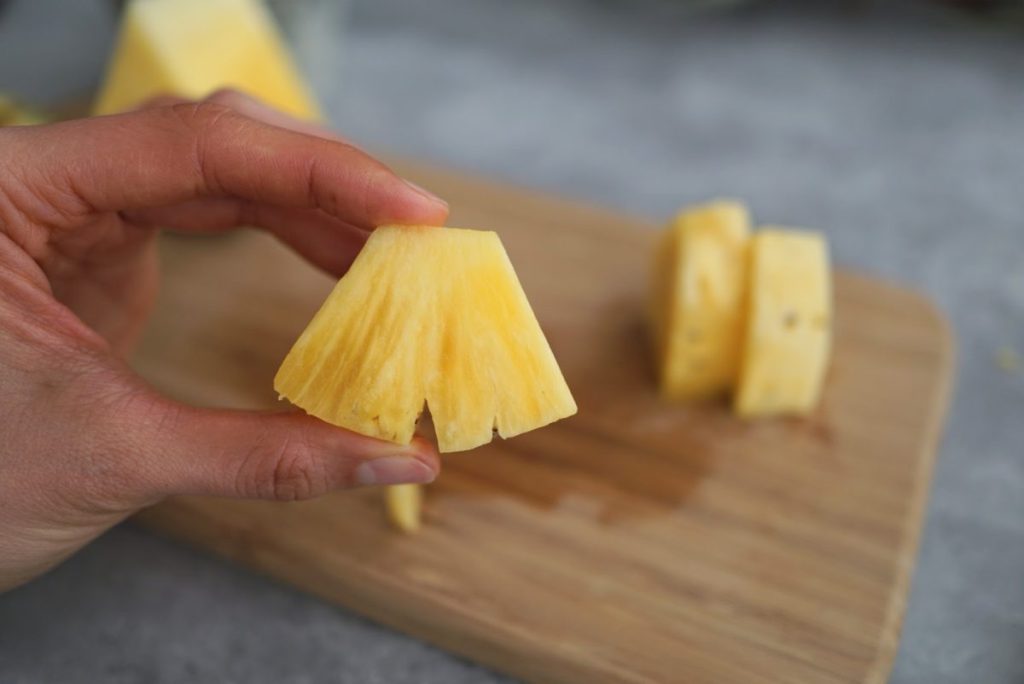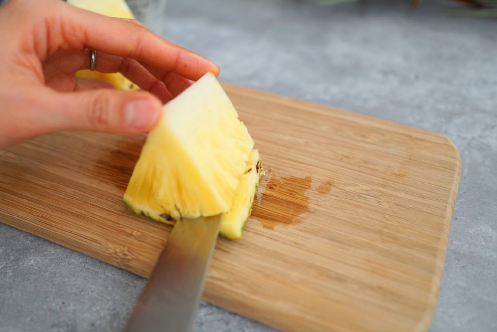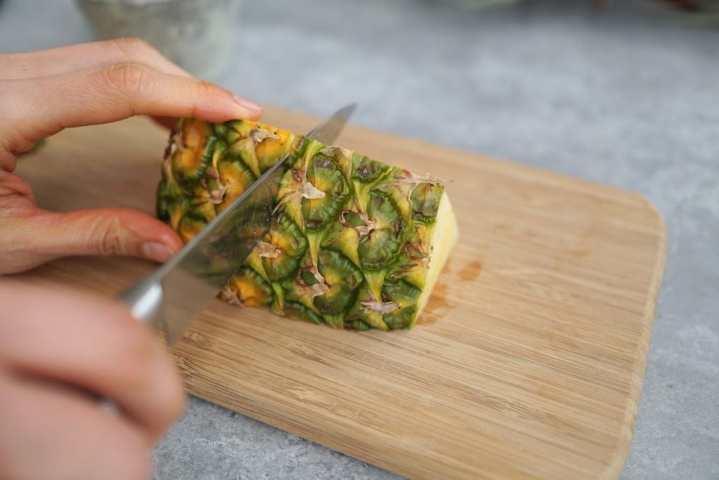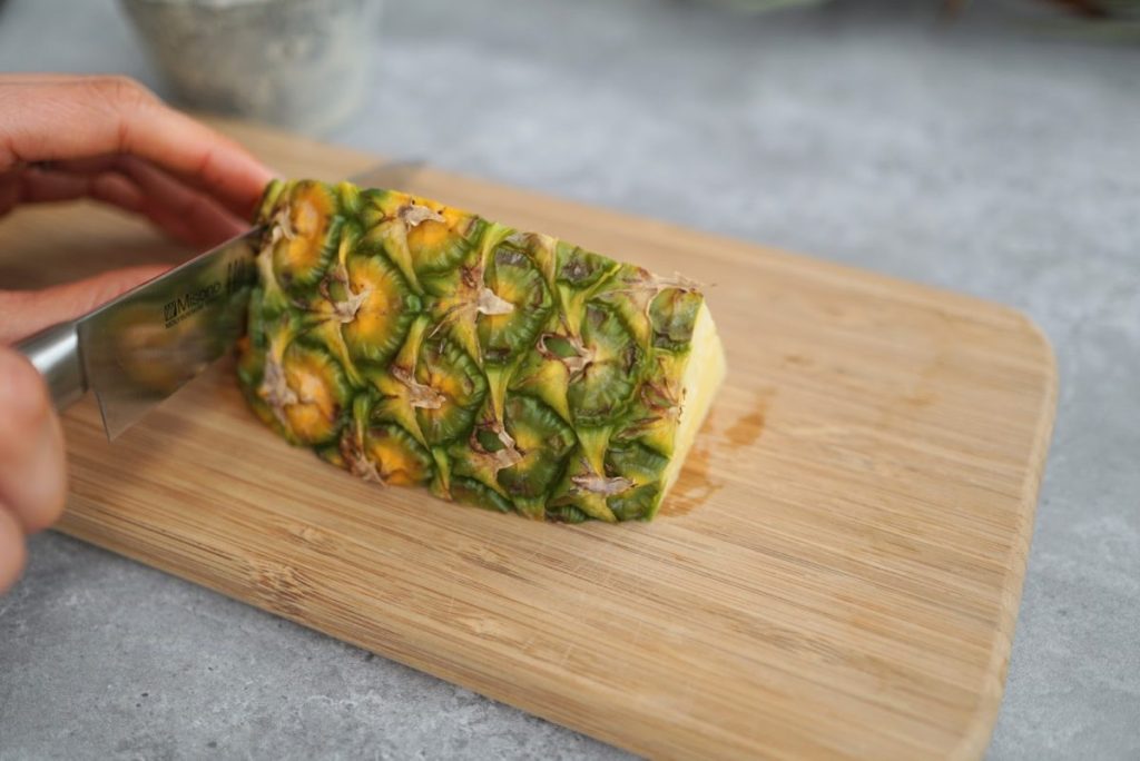 1. 1/6カットのパイナップルのヘタとおしりを切り落とします