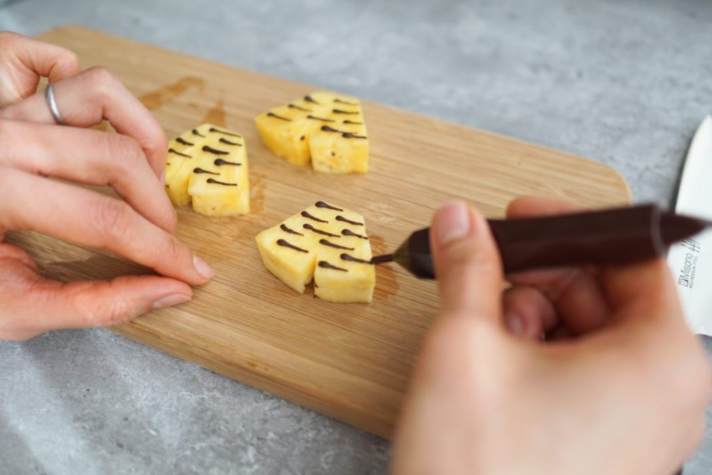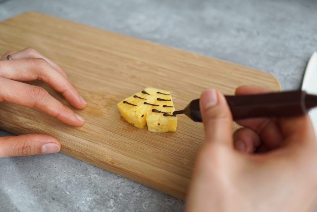 今回のアレンジでは、パイナップルにチョコペンで鬼のパンツの模様を描きます。