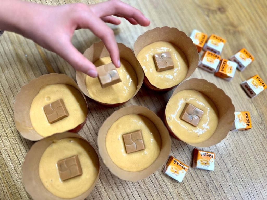 材料を混ぜて、カップに入れて、お好みの量の「チロルチョコ」の「きなこもち」を入れます。「きなこもち」は1個でアクセントに、2個でたっぷり濃厚な味わいになります。