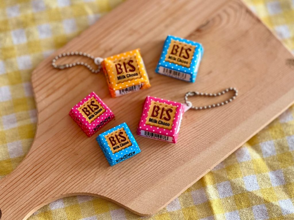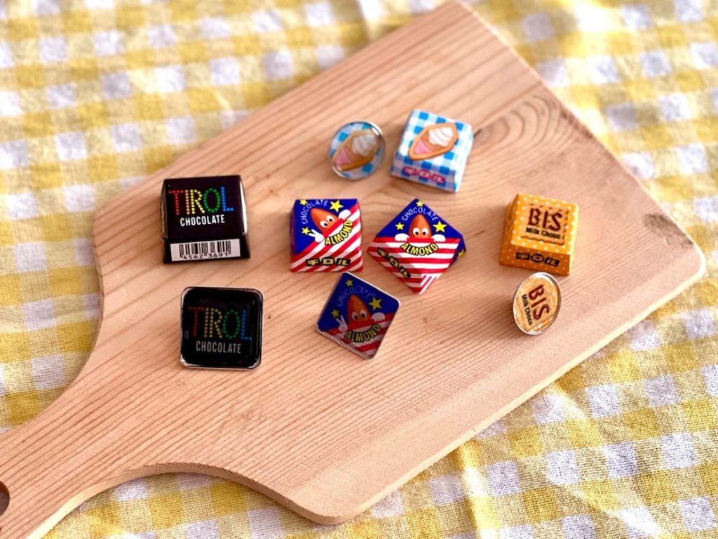 パッケージを切り取って100円ショップなどで売っているピンバッジにセットすれば、かわいい「チロルチョコバッジ」を作ることができます。特に、四角形のものは絵柄がピッタリ入ります。