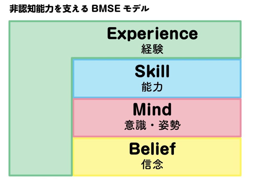 僕の本『12歳から始める 本当に頭のいい子の育てかた』にも書かせていただいているのですが、非認知能力を構造で捉える「BMSEモデル」というものがあります。この構造が、それぞれが持っている能力を表していると考えてください。