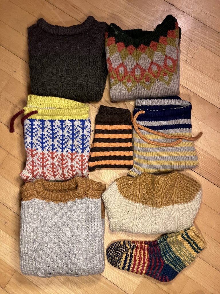 育児中の楽しみは、Netfilxで好きなプログラムを見ながら編み物をすることだというマイさん。毛糸のズボンやセーターはどれも色合いもかわいい!