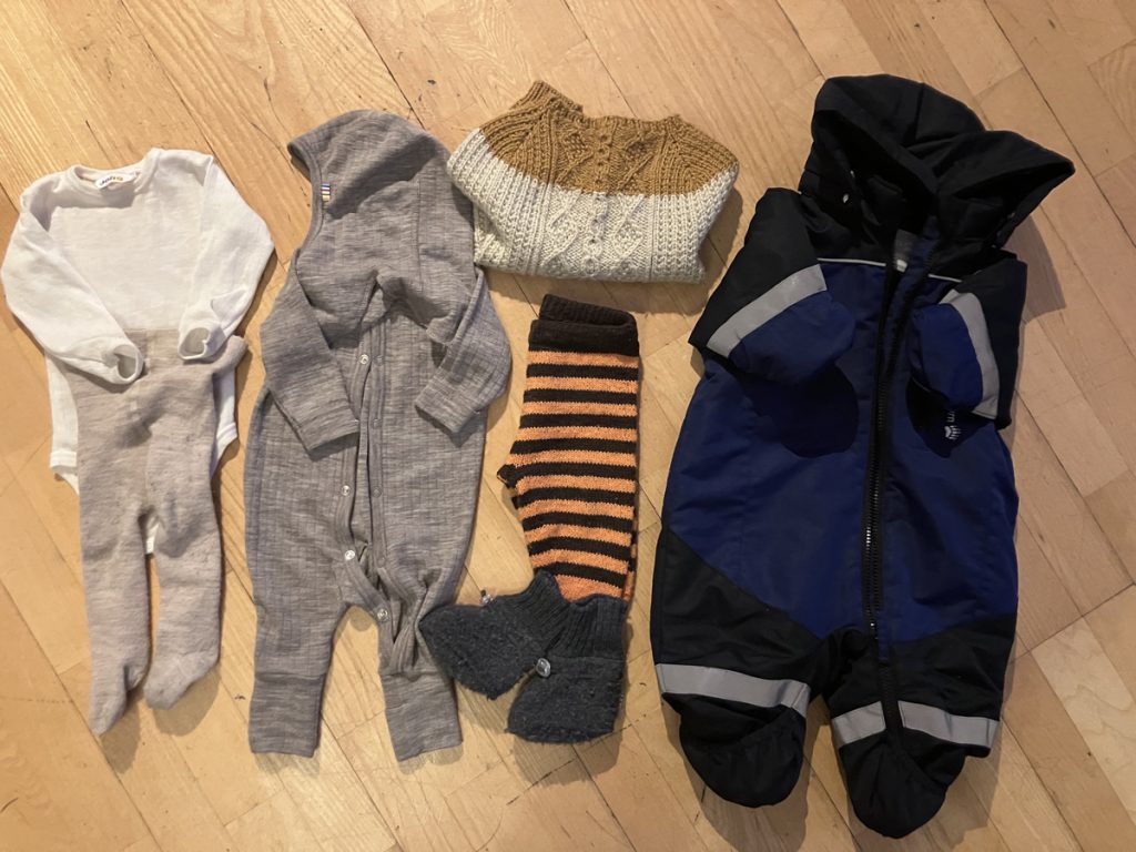 真冬の時期に、1歳〜2歳くらいの子が外で過ごすときの服装。薄めのウールのインナーを着て、その上からウールのズボンとセーターを着込み、さらにスキーで着るようなジャンプスーツを着るのが基本のスタイル。外に出かけるだけで一苦労です。