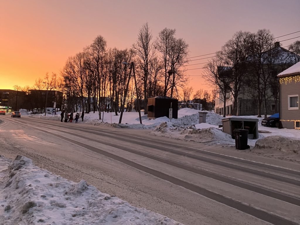 冬は2か月ほど太陽が昇らない極夜がある。こちらはいちばん太陽が近づく、お昼の12時頃の一枚。この時期は特に夜泣きなど子育ての疲れが、体にもメンタルにも堪えます。