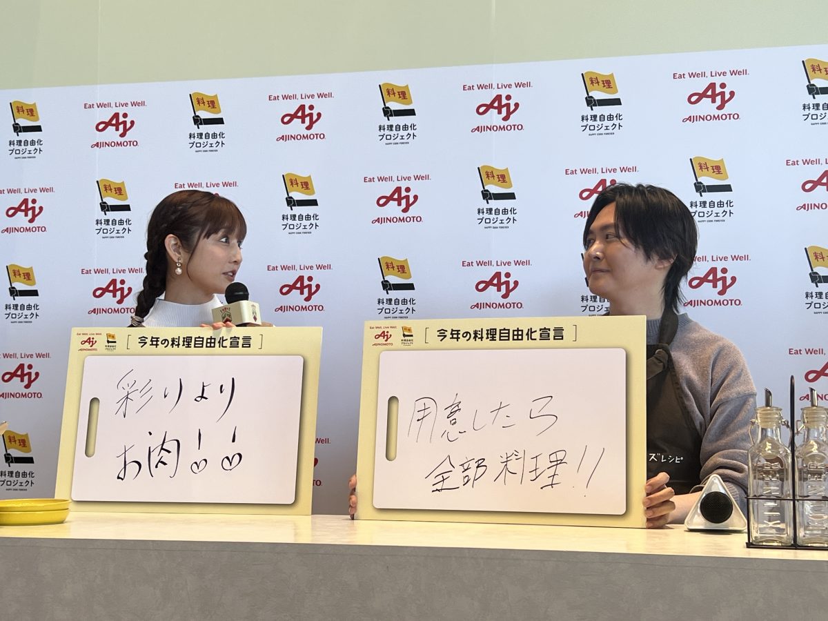 今年の「料理自由化宣言」を発表。小倉さんは「彩りよりお肉!!」、リュウジさんは「用意したら全部料理!!」でした。