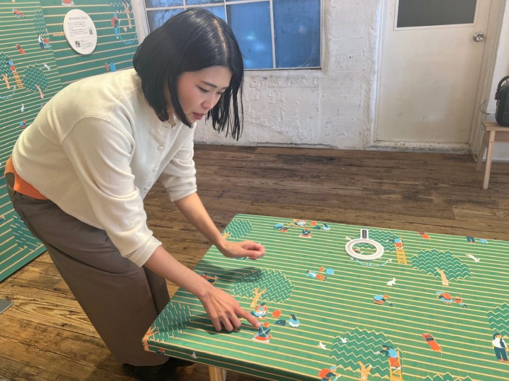 会場には印象的なグリーンが広がるオリジナルのテキスタイルが飾られていて、来場者の目をひきます。「土屋鞄」の2027年入学用ランドセルのカタログや店舗のウィンドウを飾るテキスタイルです。