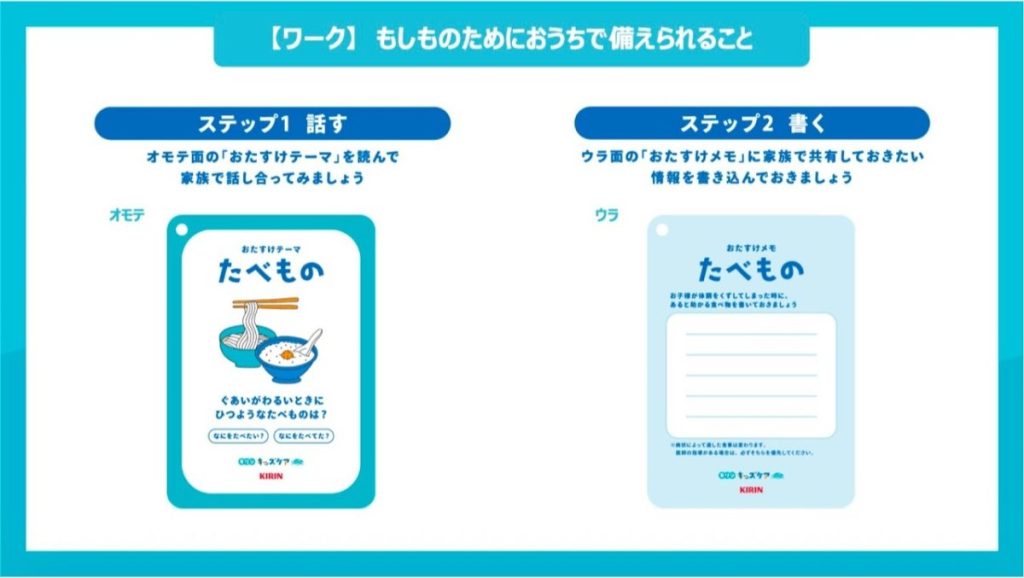続いては、家族ごとに分かれてのワークの時間。キリンが作成した10のテーマが書かれている「もしものときのおたすけカード」を使って、テーマごとについて家族で話し合います。