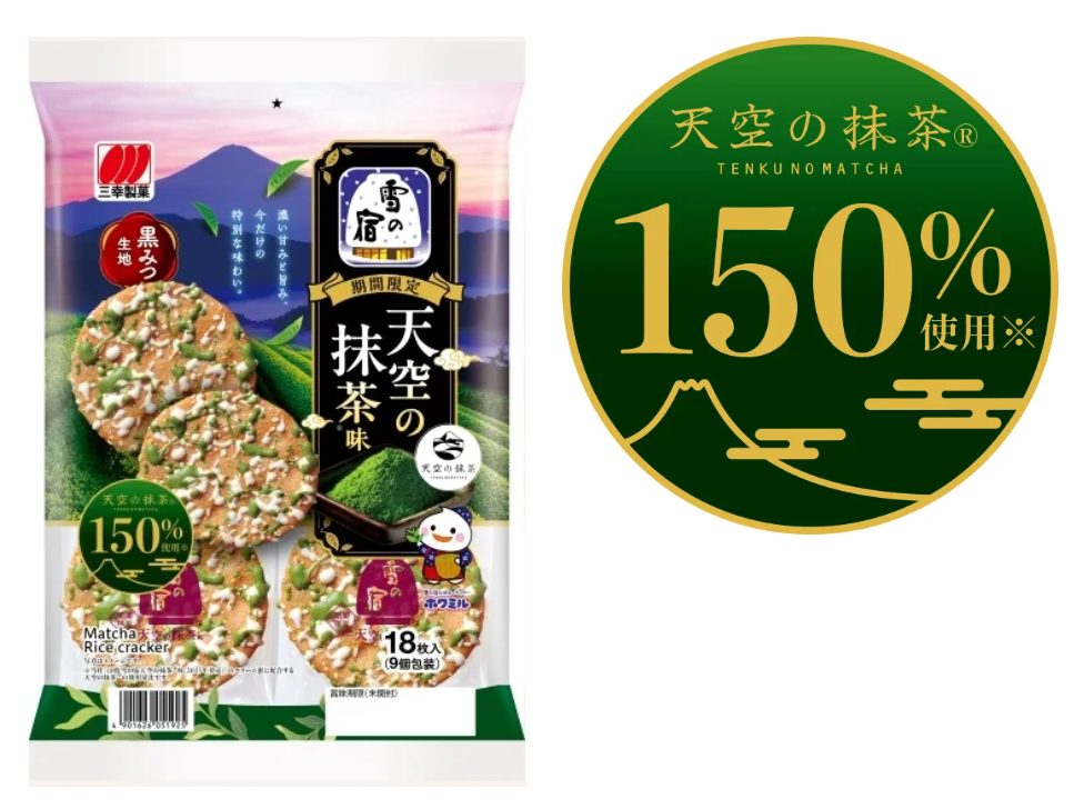 「雪の宿 天空の抹茶®味」は、黒みつを練りこんだソフトな食感のおせんべいに、ミルククリームと抹茶クリームを重ねてかけることで、黒みつ・ミルク・抹茶の風味が絶妙に調和した深い味わいを楽しめる一品です。昨年より抹茶クリームには「天空の抹茶Ⓡ」を前年比150%使用し、より豊かな香りとうまみ、上品な苦みが引き立つ仕立てになっています。