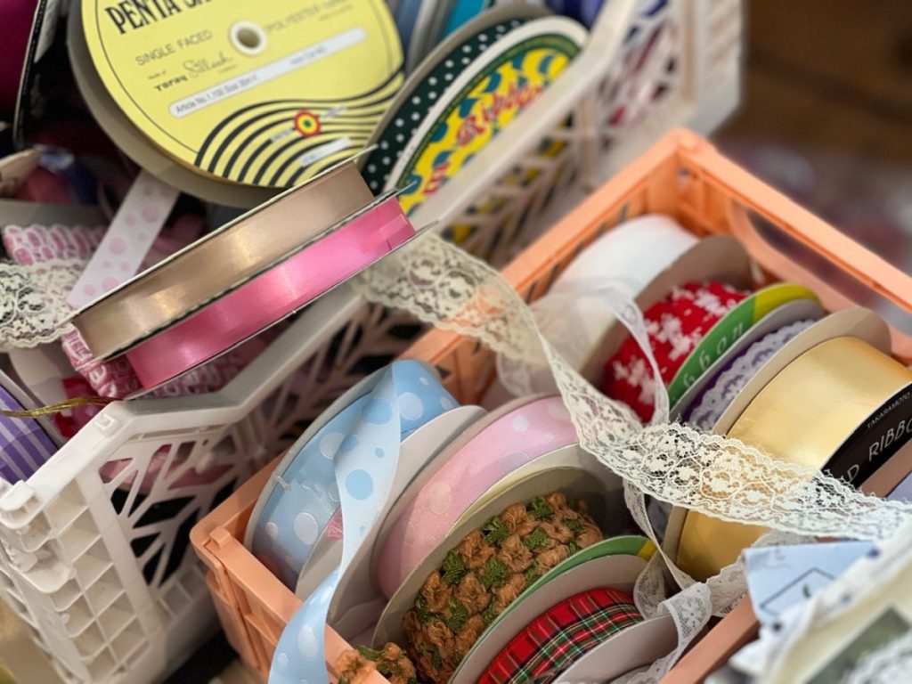 ずらりと並べられた素材を使って、自由にアート作品を作っていきます。色とりどりのリボンやさまざまなテクスチャーの布や紙、また木片や端材、パッケージなど、見ているだけでワクワクしてきます。
