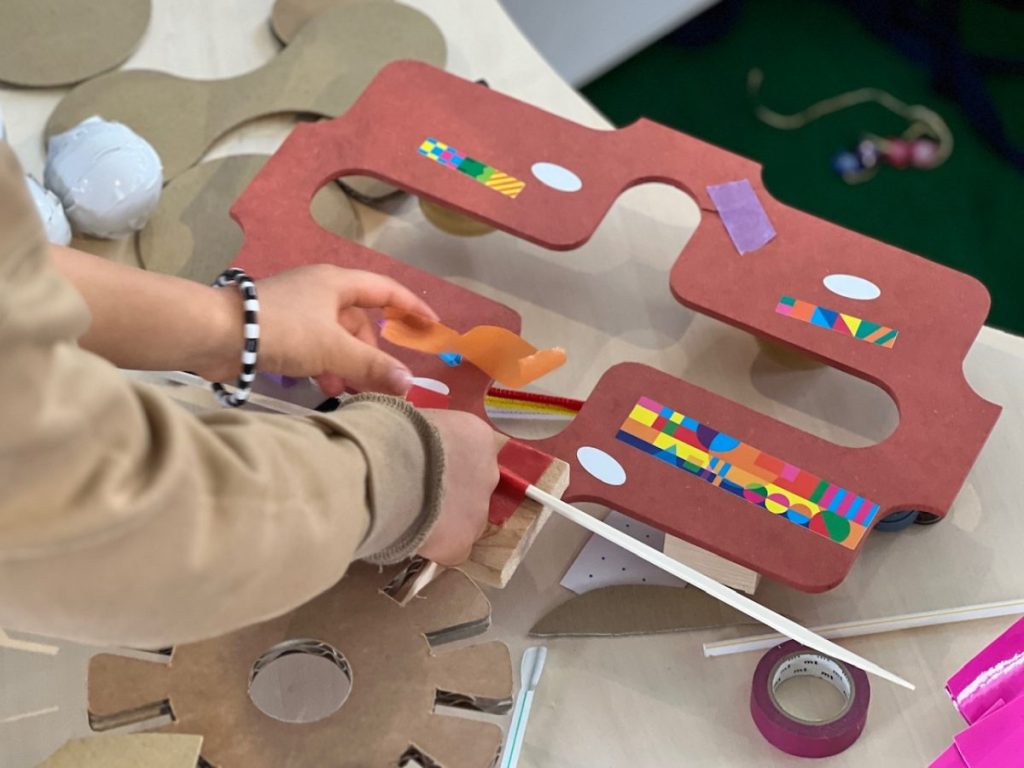 上記の写真のお子さんは、不思議な形の素材と色を生かして、マスキングテープでおしゃれにデコレーション。段ボールで歯車のような形を作り、ロボットを制作しているとのことでした。